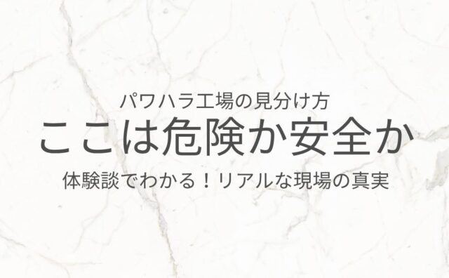 仕事 工場で孤立しやすい人の7つの特徴と解決策!安心して働くコツを紹介 工場で孤立してツラい……そんな悩みを現場歴10年の私が解決します!孤立する人の特徴7つと立ち直り方を体験談つきで解説。改善できなければ転職という選択肢も紹介します。 2025.10.27 仕事工場勤務のリアル